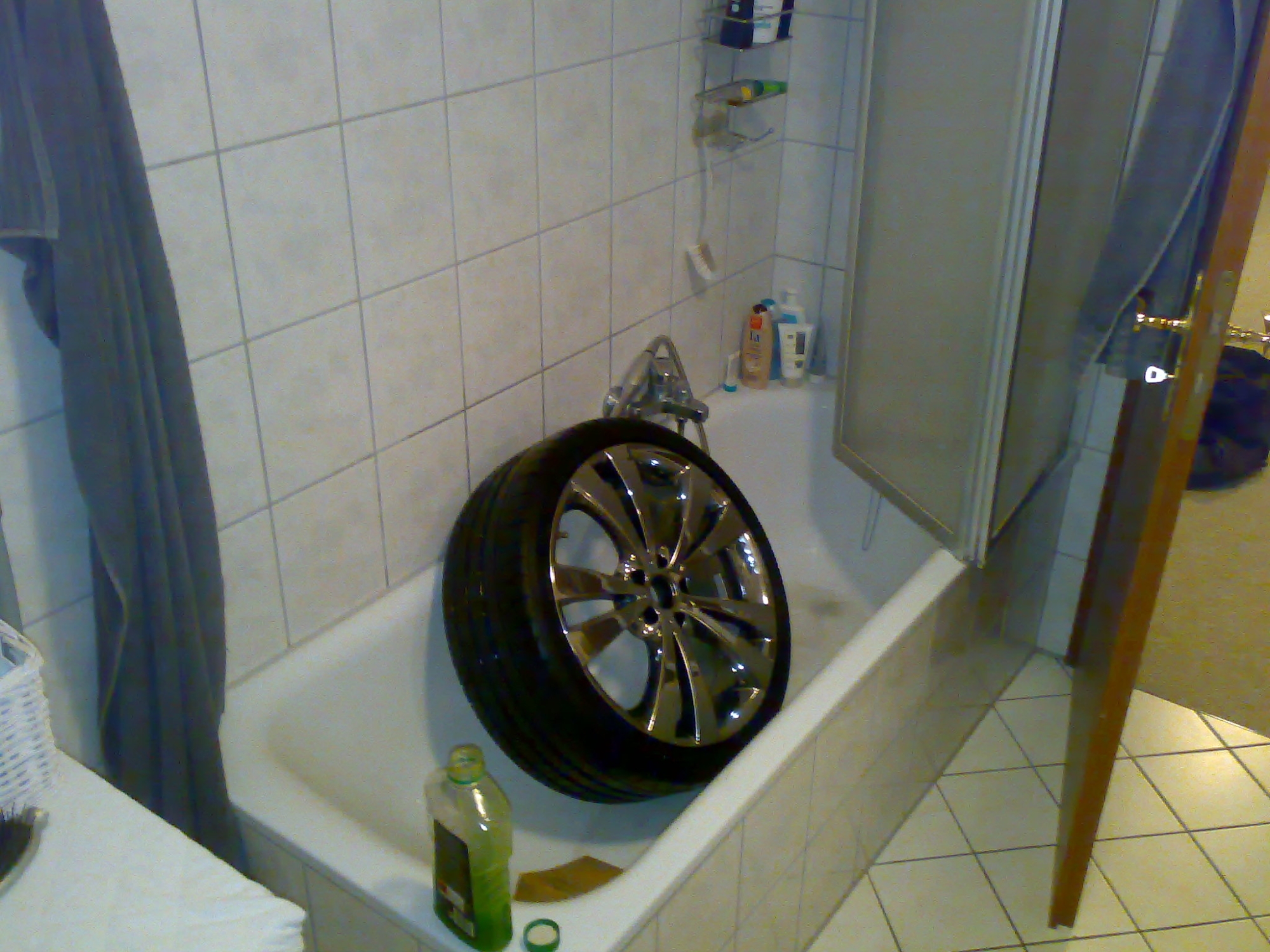 wie geil, ein warmes vollbad für die felgen. sag mal, welchen badezusatz sieht man denn da am badewannenrand ?